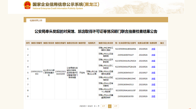 2021年,尖山公安分局牵头发起了对辖区内宾馆、旅店取得许可证等情况部门联合抽查检查,配合部门为卫健部门、消防救援部门,通过“事中事后监管系统”随机抽取检查宾馆、旅店共计九家,目前,已完成全部检查工作并公示。