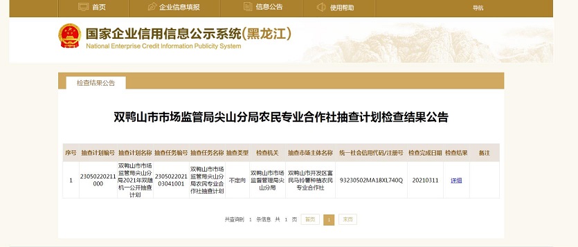 3、双鸭山市市场监管局尖山分局农民专业合作社抽查计划1户,已完成检查工作,并录入系统及公示;