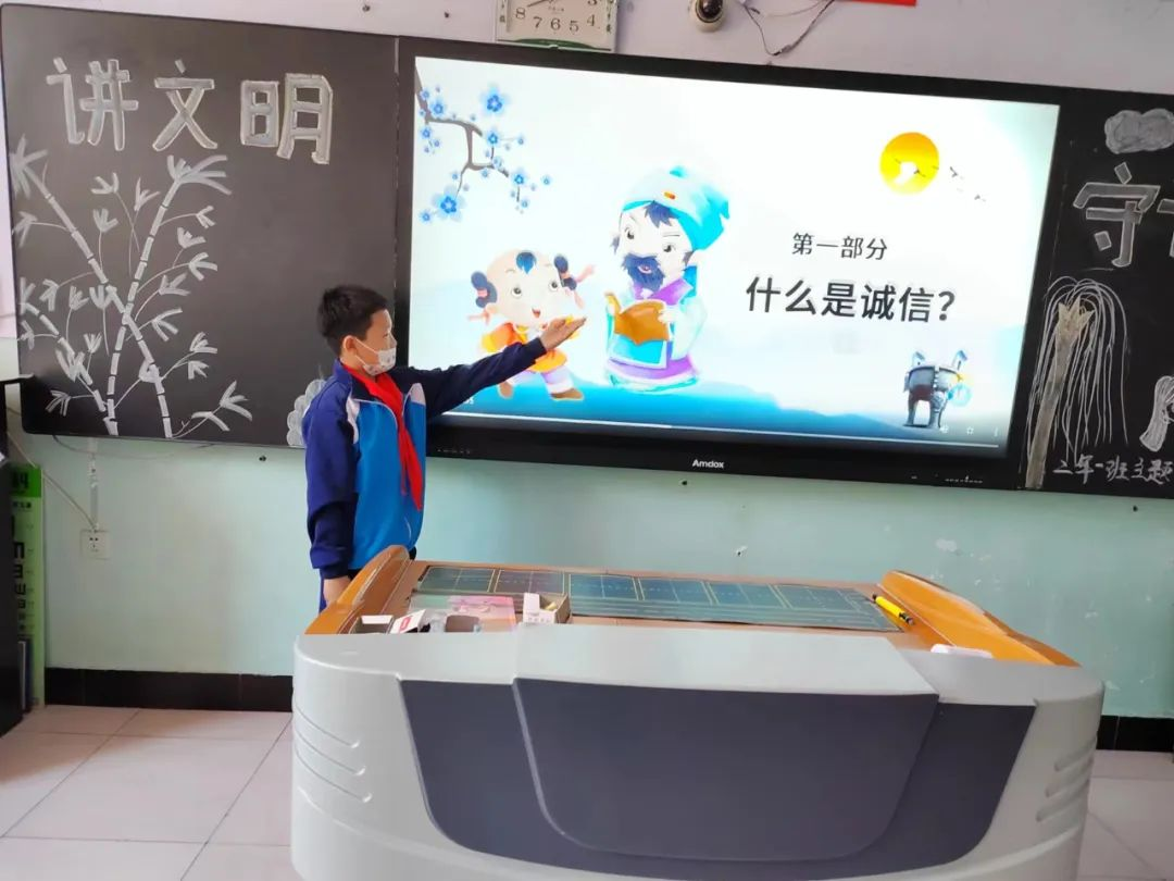 各班级召开“讲文明,守诚信”主题班队会,同学们相互分享关于诚信的名人名言和经典故事《曾子杀猪取信》《狼来了》等诚信故事使同学们明白失去诚信的后果,启发他们要做个诚实守信的好孩子。教师通过图片展示、视频欣赏等为同学们讲解了何为诚信、怎么做才是诚信的体现等相关知识,使同学们懂得诚信就是说老实话、办老实事、做老实人。