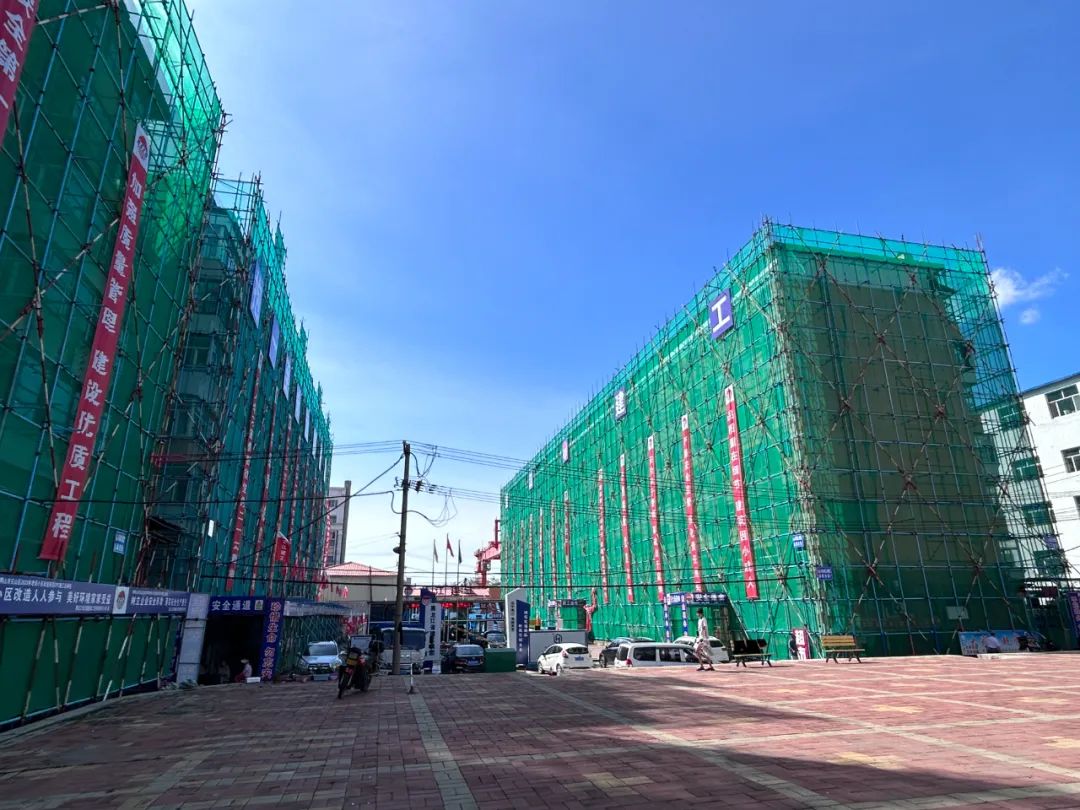 此次改造项目包括楼体外立面保温及粉刷、地面破损修复、管网改造等。目前正在进行架体搭设及楼体外立面保温工作。